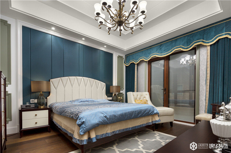 臥室延續藍色系,既呼應了客餐廳空間的色調,又營造了沉穩靜謐的休息氛圍。對于被忙碌生活以及工作包圍的業主來說,這樣的空間可以緩解白日的疲憊,讓身心得到有效的放松!